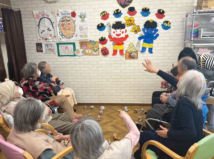 節分の日に皆さんで作った壁画の鬼に向けてダンボールで作った豆で豆まきをしました👹