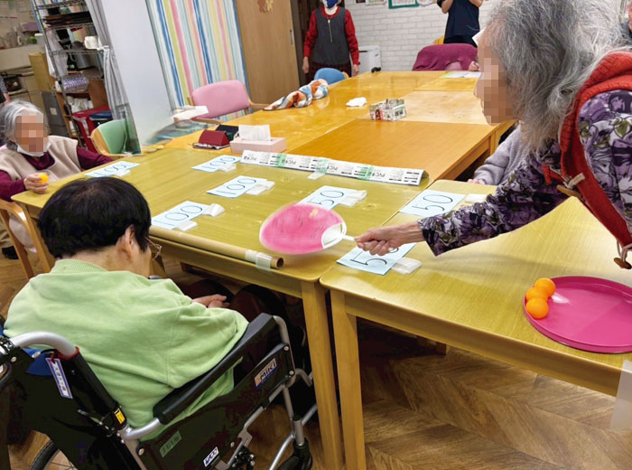 うちわを使い、ピンポン玉を飛ばしてテープにくっつけるゲームをしました!