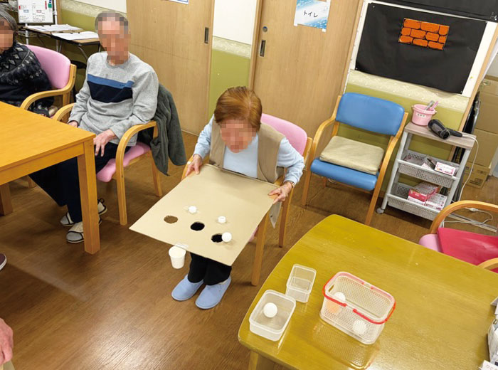 穴から落ちないよう、段ボールから落ちないよう、ピンポン玉を上手に操って紙コップに入るように落ち着いてコントロールしてくださいね。